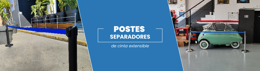Consisten en postes verticales que pueden ser fijados en el suelo y tienen una cinta extensible que se puede ajustar en longitud y retráctil para recogerse cuando no se necesita. La cinta extensible retráctil se conecta a otros postes separadores para formar una barrera visual que impide el paso o direcciona el flujo de personas. Además, la cinta puede ser personalizada con mensajes de advertencia o información de guía para los visitantes. Estos postes son una opción popular para la organización de eventos, filas de espera en lugares con alta afluencia de personas y control de acceso a áreas restringidas.